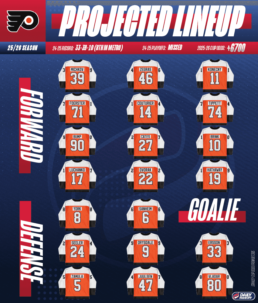Philly is eager to explore the upper limits of the 20-year-old’s game, and the simplest way to do that is to keep him across from Konecny, who led the team in scoring (76 P) for the fifth season in his past six tries. A fan-favorite pest, Konecny made up for depressed shooting volume (2.29 shots per game, down from 3.21) with career-best playmaking (52 A) last season. Captain Sean Couturier centered the duo 24 times and remains Philadelphia’s top pivot, though his production (44.5 P per 82 GP since 2023) has waned since a series of career-threatening back issues.