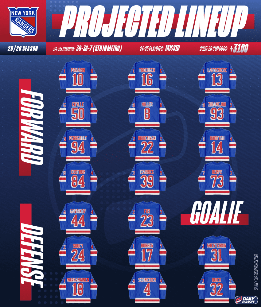We can expect Fox and Gavrikov to log massive minutes this season, as the D-corps depth drops off significantly behind them now that Trouba and Miller are gone from last year’s top four. Carson Soucy and Will Borgen will likely form a physical second pair that would ideally be a third pair on a true contender, while the Rangers will hope the big, mobile Urho Vaakanainen and Braden Schneider, still only 26 and 23, respectively, will progress under year 1 of Mike Sullivan.
