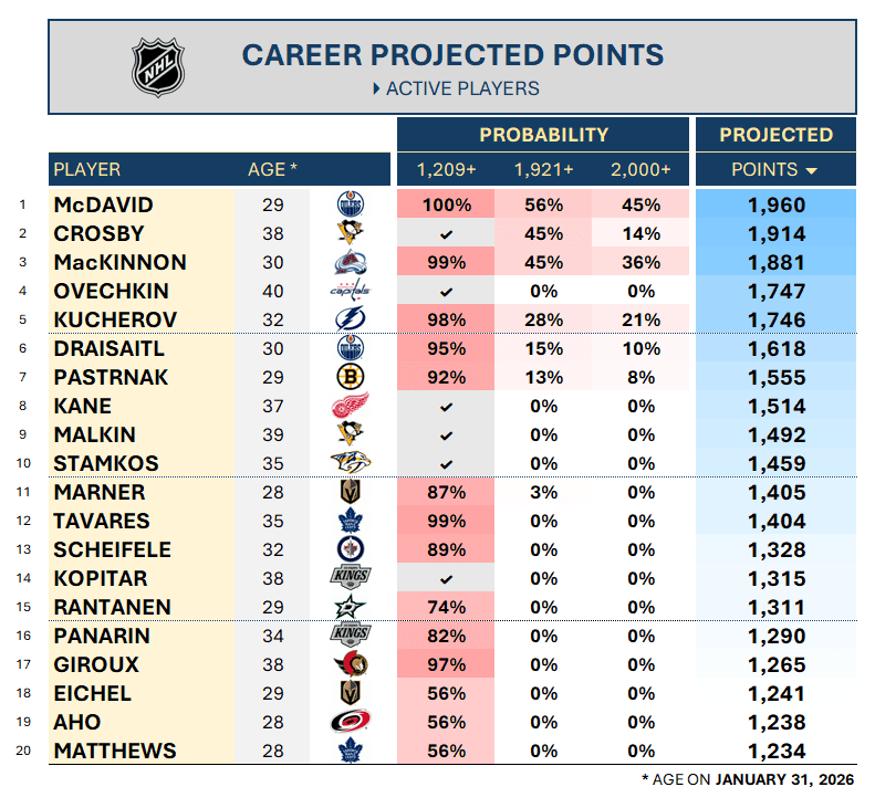 McDavid will need about 781 points beyond this season to reach 2,000. Very doable. But it’s no formality. Edmonton‘s captain will need to produce at Crosby’s level in his 30s, avoid serious injury, and play a decade with strong attendance. McDavid is a physical marvel, but he also plays with reckless abandon at a million miles per hour. Penciling him in for 75 games annually through 2036 would be a big leap. Just ask Leon Draisaitl. And what team will #97 be on? What style will they play? Will their power play still set records? The projection says it will be tight for McDavid — a 45% chance of 2,000 — with the most likely outcome of 1,960 points.