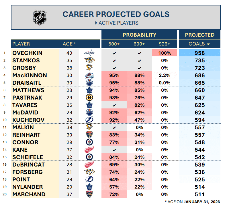 Only one player has a non-zero chance of catching Ovechkin. MacKinnon, the Rocket Richard Trophy front-runner, checks in at 2.2% and a projection of 686 goals. One year ago, Draisaitl (8.3%), Matthews (8.2%), and Pastrnak (4.4%) had paths to 926 goals. But for various reasons each will end 2025-26 with underwhelming goal counts in critical seasons in their primes. The collapse of Matthews’ odds to effectively nil is stunning — following up a 69-goal year with injury-fused seasons of 33 and 27 goals will do that. Matthews’ 428 goals to date, however, are six more than Ovechkin at the same age. Yes, really. So, Matthews’ odds aren’t truly zero. But it shows both how debilitating the last two seasons are on his record outlook and how incomprehensible it is that Ovechkin has 446 goals after turning 30.