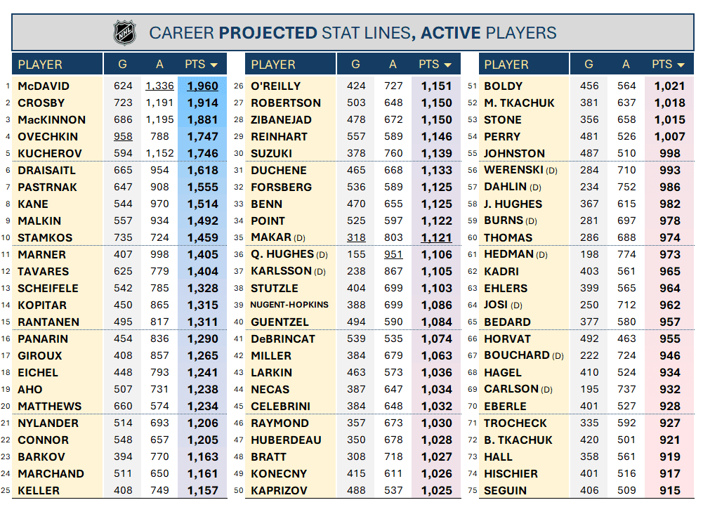 Welcome to our third annual projection of every NHL player’s final career totals.