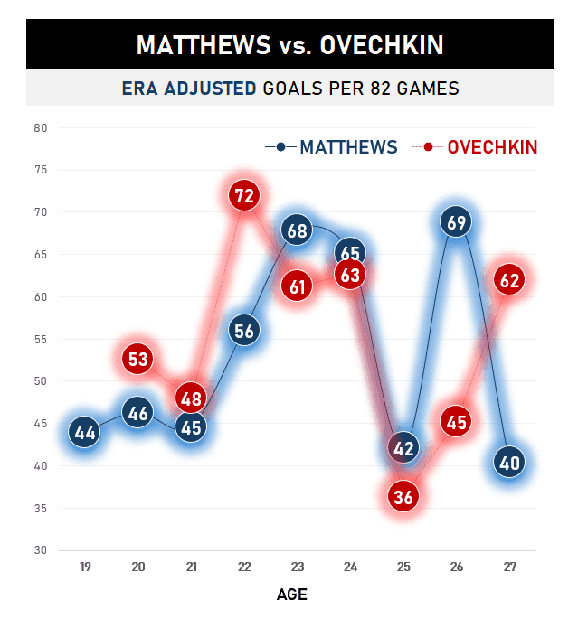 So much for consistency. Both players’ goal-scoring performances look more like an emergency room cardiac monitor than the annual results of generational snipers in their primes. At 26 years old? Matthews by 24 goals. At 27 years old? Ovechkin by 22 goals. An explicable 46-goal swing in pace.