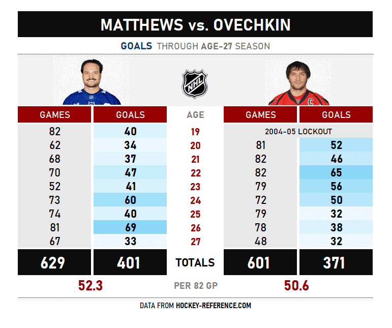 Statistically, the Matthews-Ovechkin comparison is tight. When we stack their respective performances as snipers through their age-27 seasons, the difference is razor thin.