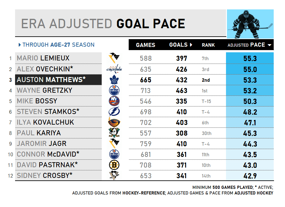 From an efficiency perspective, Matthews trails only Lemieux and Ovechkin. At 53.3 adjusted goals per 82 games, Matthews narrowly edges Wayne Gretzky. Extraordinary company.