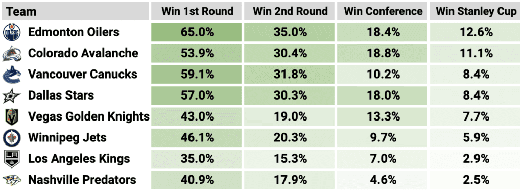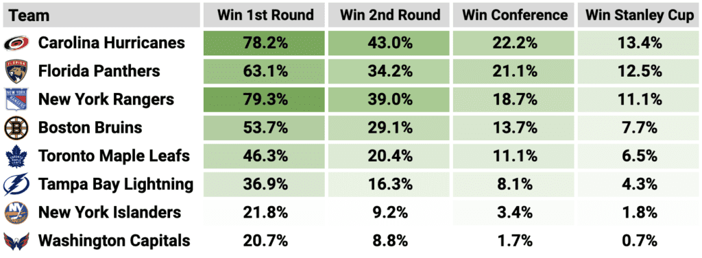To help identify the best players for the 2024 NHL Playoffs, I used the betting odds to create probabilities of each team advancing through each round. I created “expected games played” for each team using those probabilities. Once you have expected games played, I plugged it into my regular season projections model to generate projections for every skater in the postseason. I used the same probabilities to help generate team goalie projections as well.