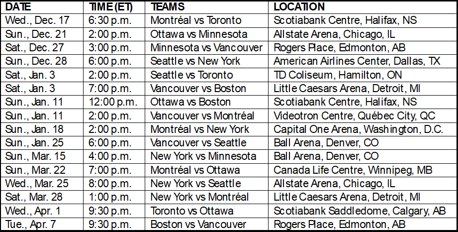 The entire 16-game 2025-26 Takeover Tour, featuring neutral-site games, will be played between Dec. 17, 2025 and April 7, 2026, primarily using venues that host NHL franchises as their primary occupants.