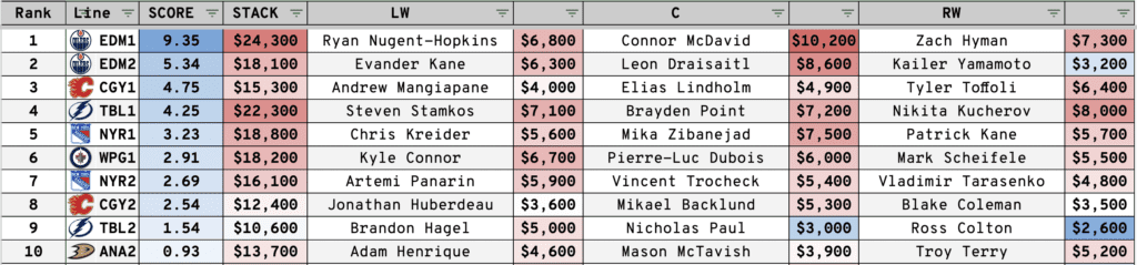 | Vatrano – Zegras – Strome Henrique ⚠️ – McTavish – Terry ⚠️ Megna – Grant – Silfverberg Jones – Lundestrom – McGinn ——————————————————— Fowler – Harrington Benoit – Shattenkirk Beaulieu – White | Nugent-Hopkins – McDavid – Hyman Kane – Draisaitl – Yamamoto Foegele – Bjustad – Janmark Kostin – Ryan ——————————————————— Nurse – Ceci Ekholm – Bouchard Kulak – Desharnais Broberg |