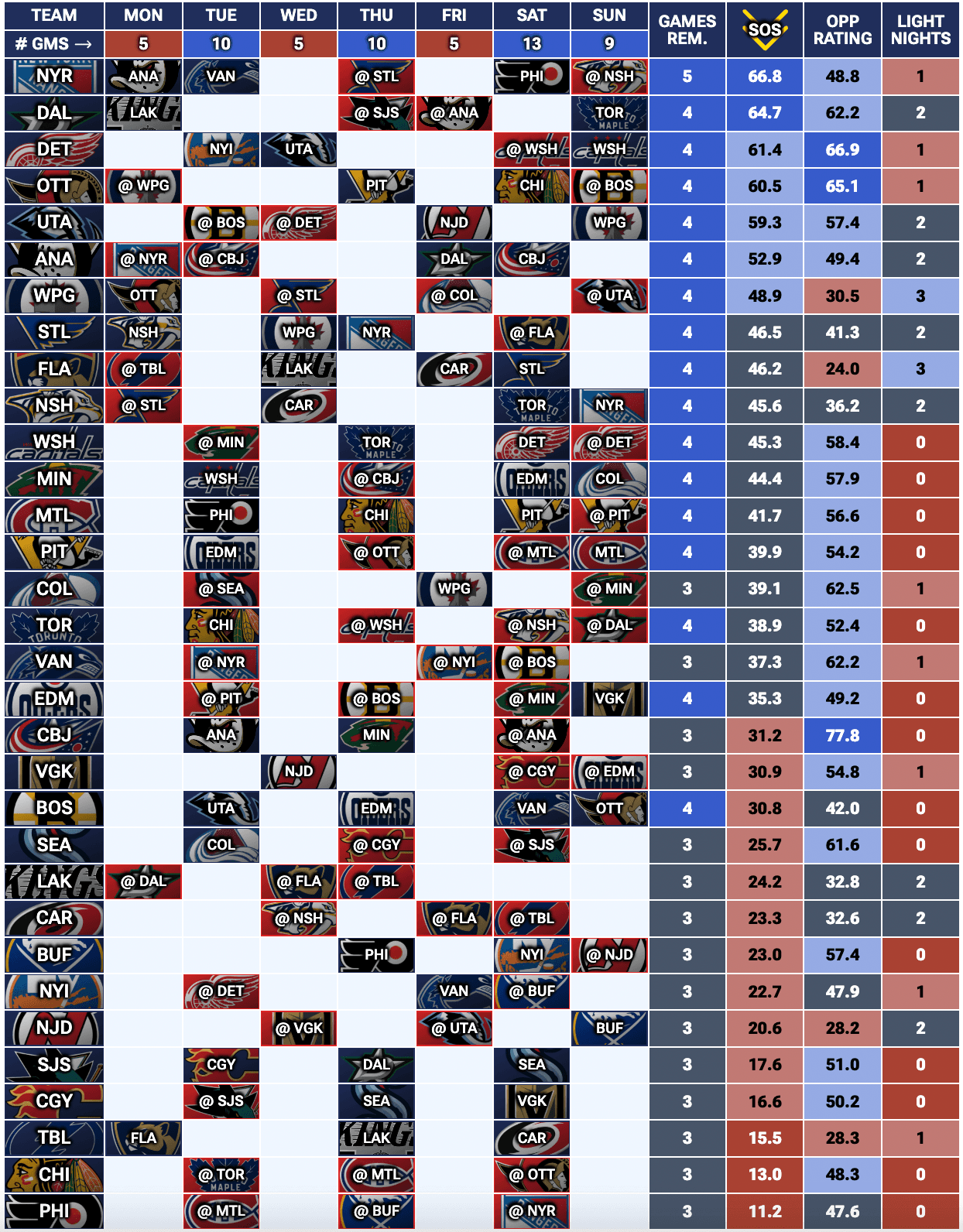 If you’re looking for a full breakdown of every team’s upcoming schedule, check out our Fantasy Hockey Strength of Schedule Tool — updated daily to show which teams have the most games and valuable light-night matchups each week.