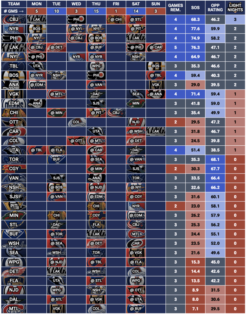 If you’re looking for a full breakdown of every team’s upcoming schedule, check out our Fantasy Hockey Strength of Schedule Tool — updated daily to show which teams have the most games and valuable light-night matchups each week.