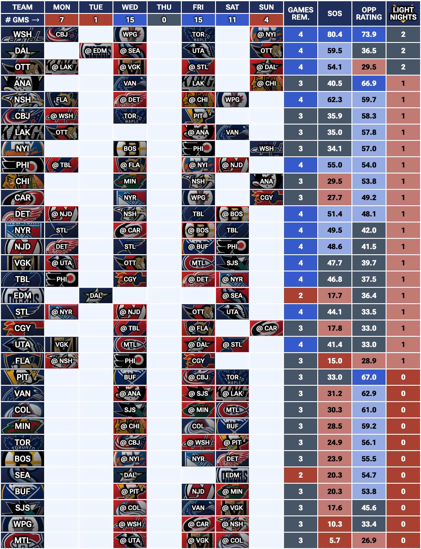 If you’re looking for a full breakdown of every team’s upcoming schedule, check out our Fantasy Hockey Strength of Schedule Tool — updated daily to show which teams have the most games and valuable light-night matchups each week.