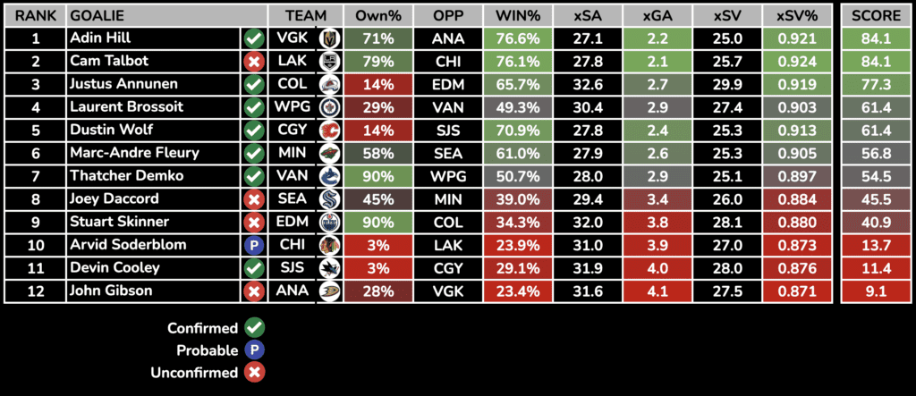 Each day, we will rank the day’s starting goalies based on their Projected Win%, Goals Against Average, and SV%. Win percentage and expected goals against is generated from Sportsbooks Odds and Implied Totals.