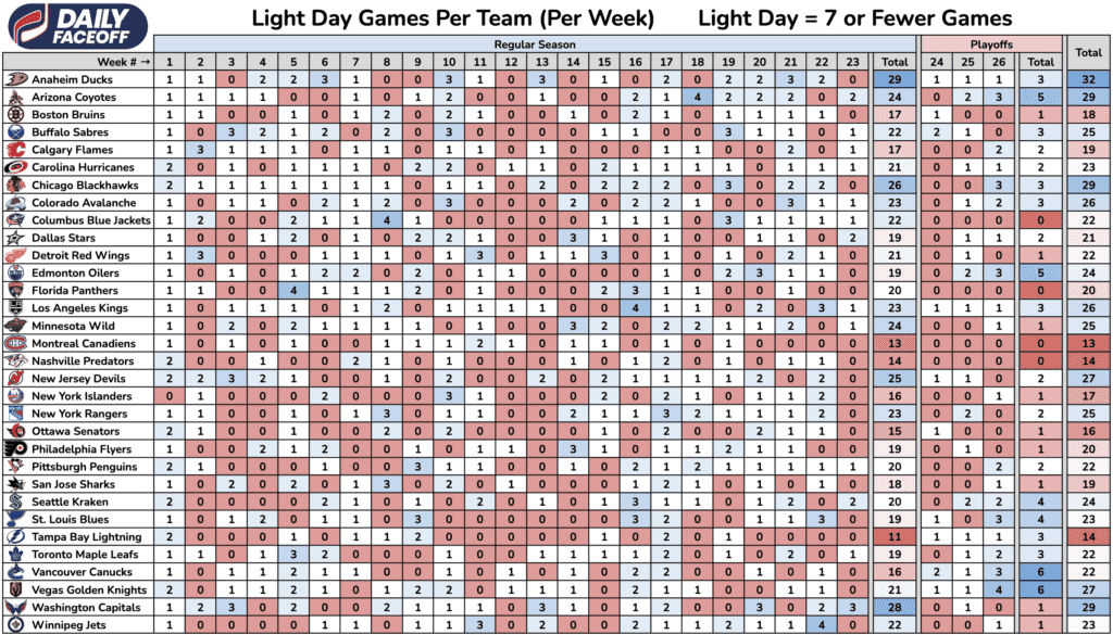A light day in the NHL is when less than half of the league is in action, which should provide plenty of flexibility in your fantasy lineup. The graphic below illustrates how many times each team plays on a light day every week and the season as a whole.
