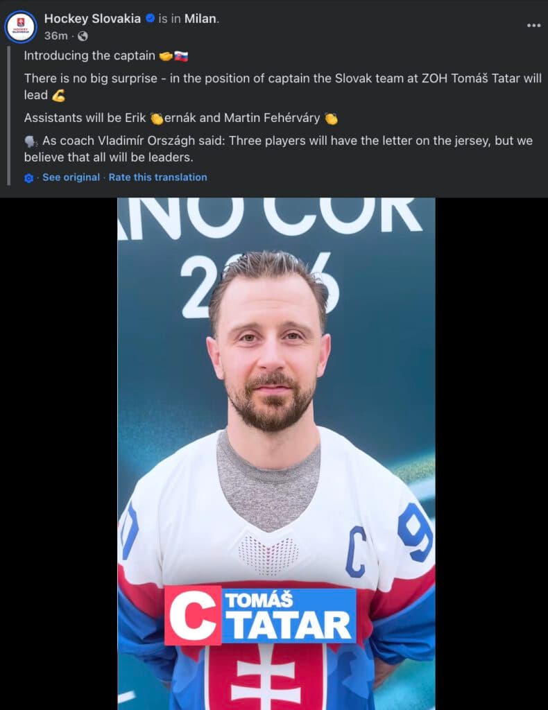 On Monday, the Slovak Ice Hockey Federation announced that forward Tomas Tatar will be the captain of the men’s ice hockey team at the 2026 Winter Olympics. Tampa Bay Lightning defenseman Erik Cernak and Washington Capitals blueliner Martin Fehervary will be the team’s alternates.