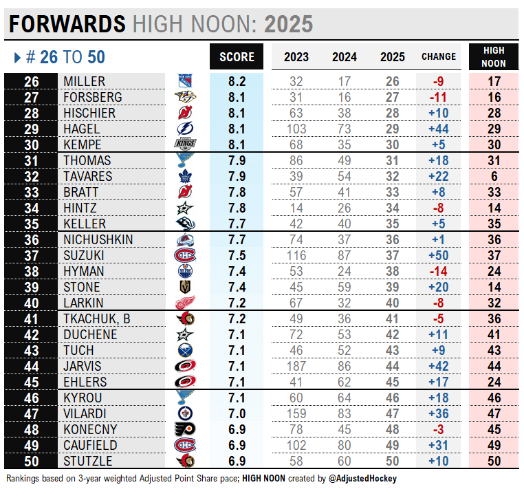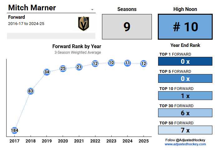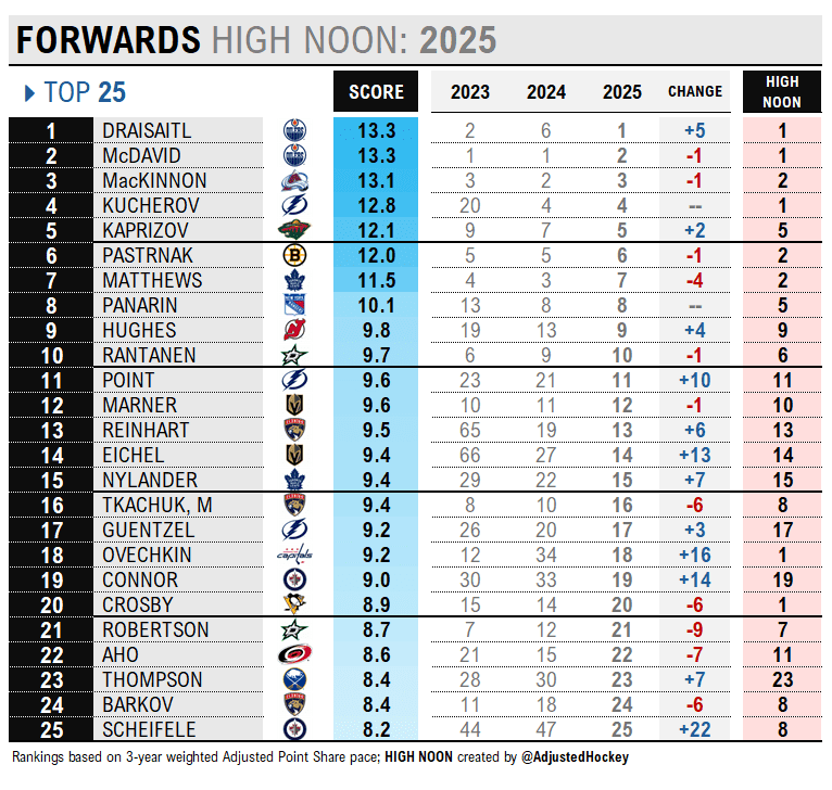 Just 28 years old and fresh off a fifth-place finish in points (102) paired with a seventh-place Selke finish, there are few players as dynamic or well-rounded as Marner. 2025 represents his fourth straight year among the league’s top dozen forwards in High Noon. His company over the period? Fellow superstars Draisaitl, McDavid, MacKinnon, Pastrnak, Matthews and Mikko Rantanen. Will Marner cement a Hall of Fame legacy over his new contract, or was his best hockey played in a Maple Leafs‘ sweater?