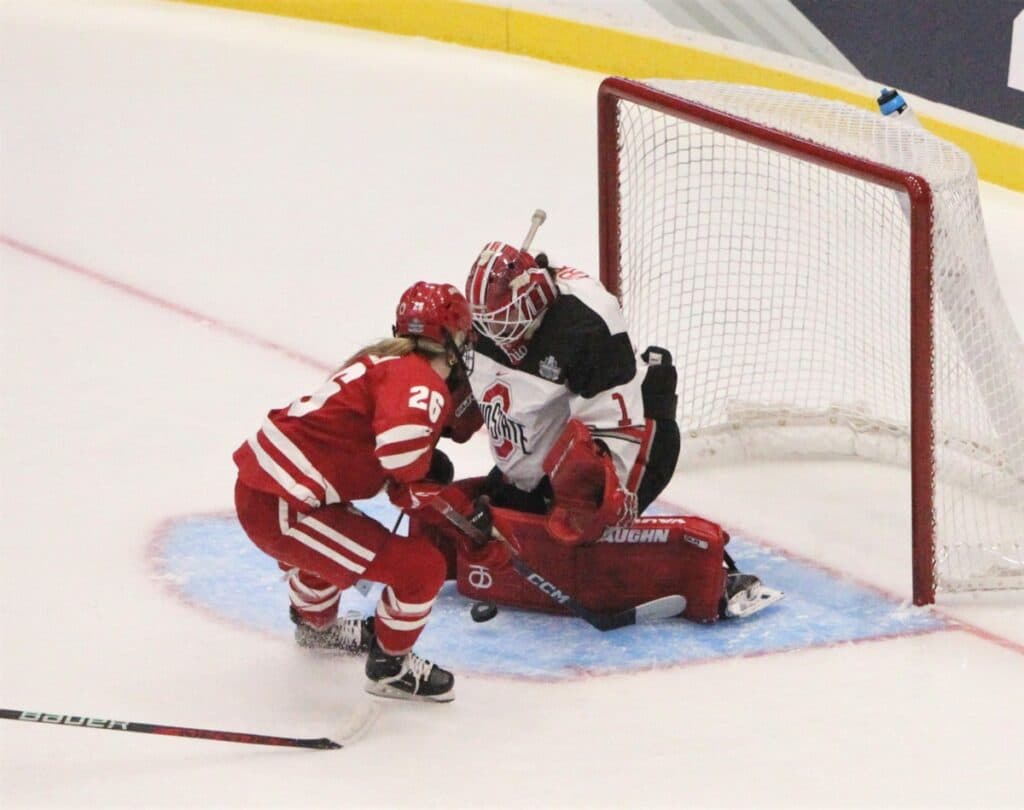 Just like last year in Duluth, it was an intense battle. Neither team wanted to make a mistake early, with the play ramping up in the second period. Wisconsin outshot Ohio State in the middle stanza, with both the Badgers’ Ava McNaughton and the Buckeyes’ Raygan Kirk being forced to make some big saves, but it was still anyone’s game heading into the final minutes of regulation.