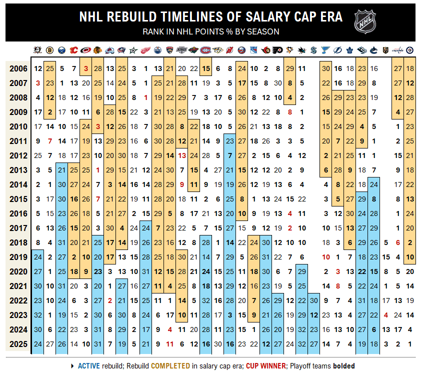 The rebuilds will be ranked on how likely each franchise is to win a Stanley Cup in the next seven seasons. After all, that should be every general manager’s goal: construct a high-end roster that delivers a strong Cup contention window. Call it the 2027 through 2033 Cup window, if you like.