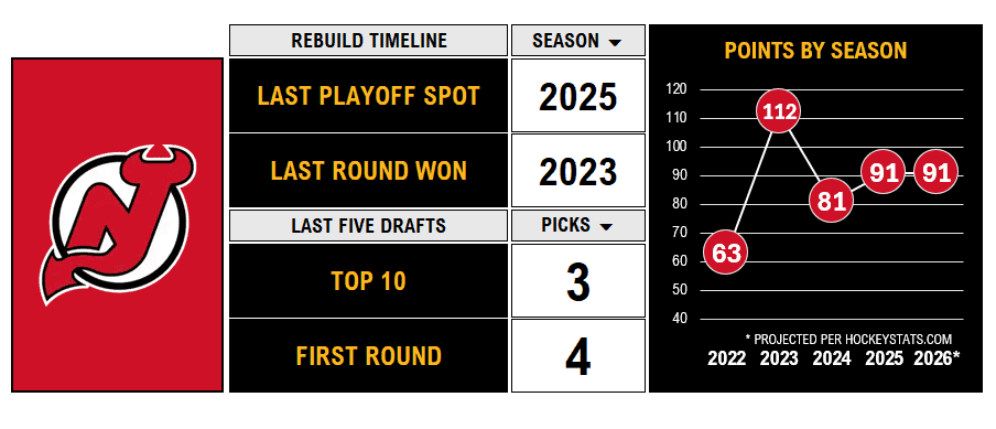 New Jersey made the postseason last April and is only a few years removed from a 112-point performance. But this season hasn’t gone according to plan. Top-four picks Simon Nemec and Luke Hughes have struggled and aren’t reminding anyone of Scott Niedermayer. Jacob Markstrom — signed through 2028 — is a problem. There isn’t a lot of notable help left to pull from the system. The front office is handcuffed from its addiction to long-term deals with player-friendly trade clauses. And superstar Jack Hughes may be out for six weeks with a new injury by the time you’ve read this sentence.