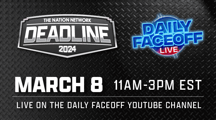 Get ready for the Daily Faceoff Live Trade Deadline Show, coming to you on March 8th LIVE from 11 AM to 3 PM EST!! Join Tyler Yaremchuk, Frank Seravalli and friends for 4 hours of non-stop action as they dive deep into the heart of the trade deadline. They will be breaking down every trade, discussing the impact on teams, predicting the playoff picture, and giving you the inside scoop on all the wheeling and dealing happening around the league. Tune in live on March 8th from 11 AM to 3 PM EST for the The Daily Faceoff Live Trade Deadline special you won’t want to miss!